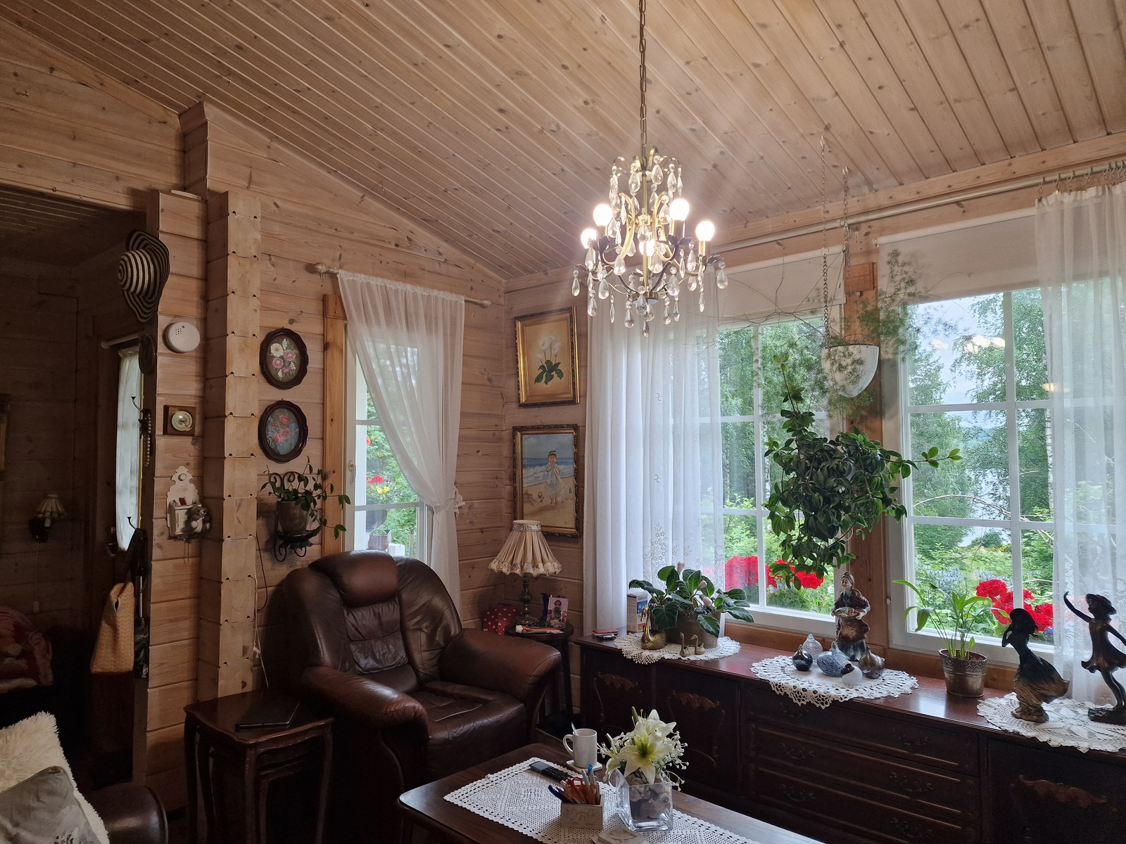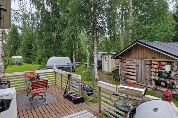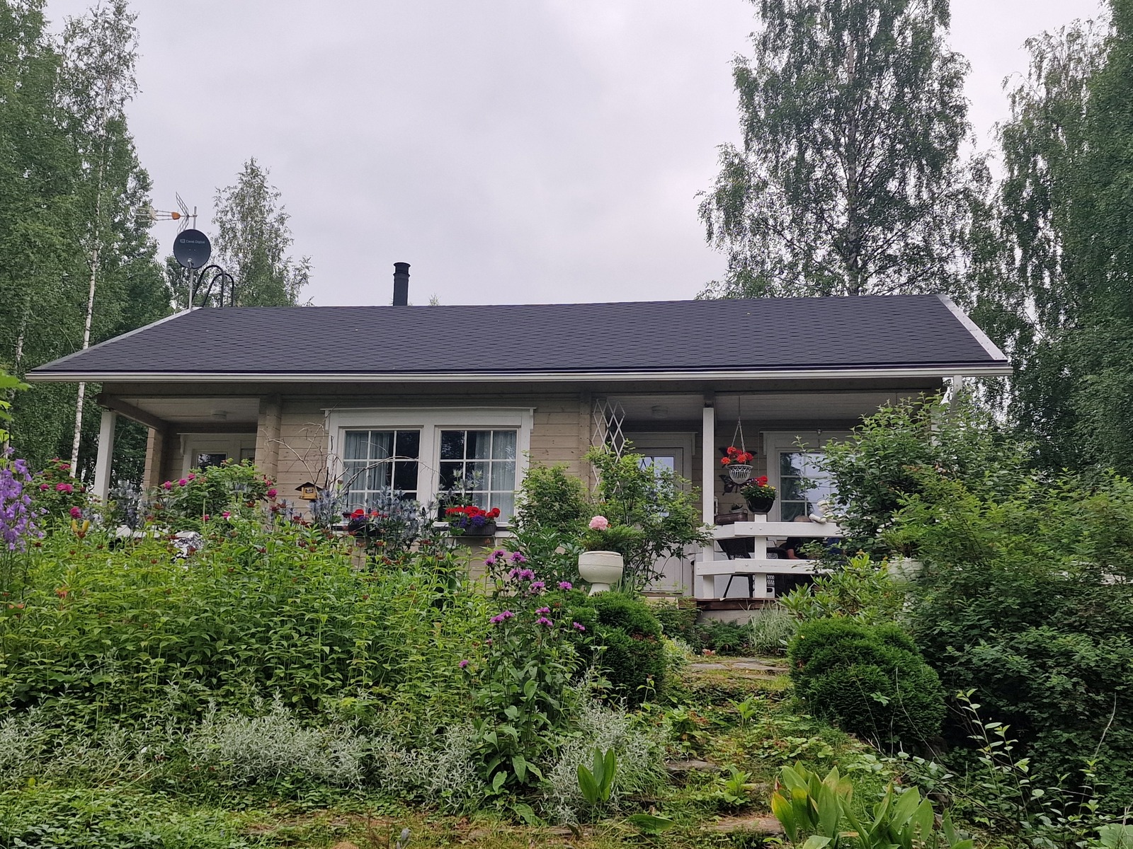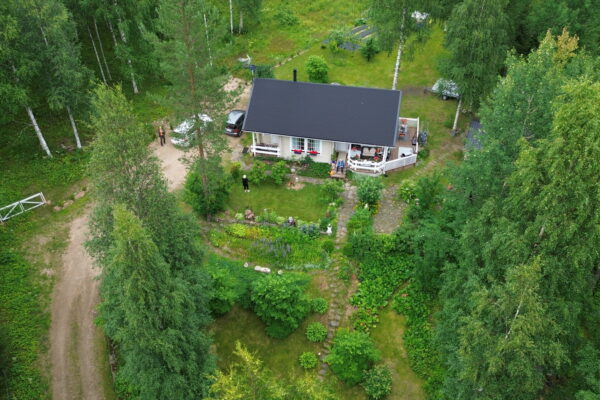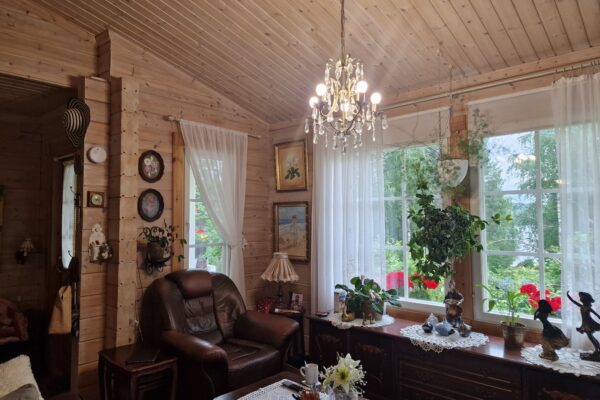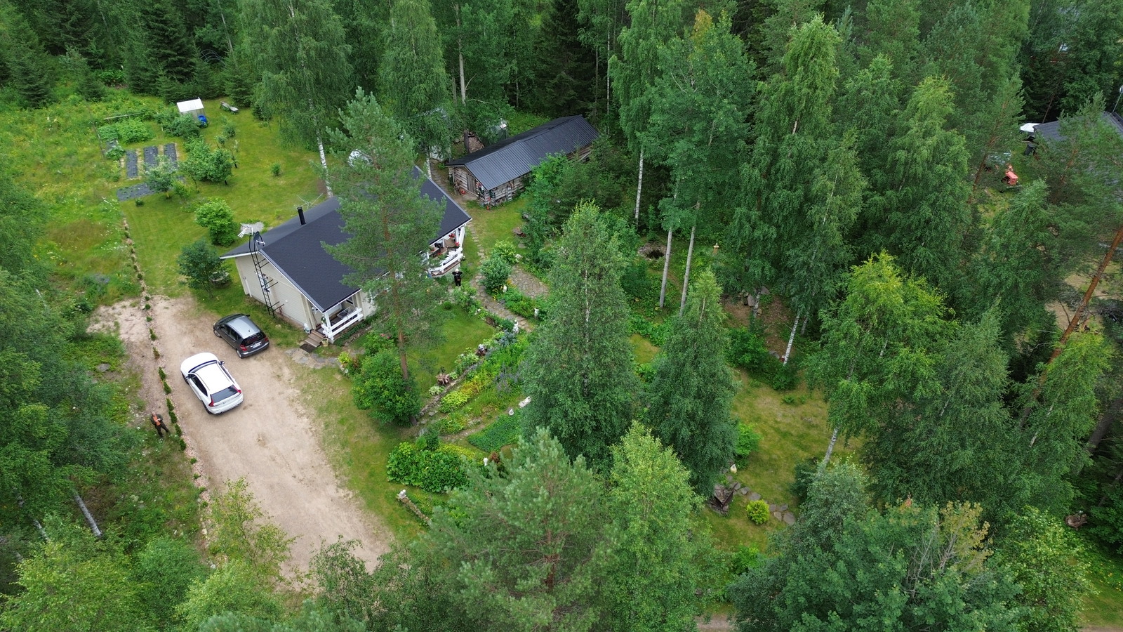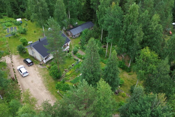 Uudehko hirsitalo on valmistunut v. 2012, sen kokonaispinta-ala on 74 m2, sisältäen olohuoneen, kaksi makuuhuonetta, kodinhoitohuone, pesuhuone/WC, sauna ja kaksi katettua terassia sekä ison n.18 m2 kattamattoman terassin. Päärakennus on muutettu v. 2022 kaavamuutoksella vakituiseksi asunnoksi.