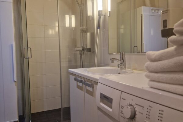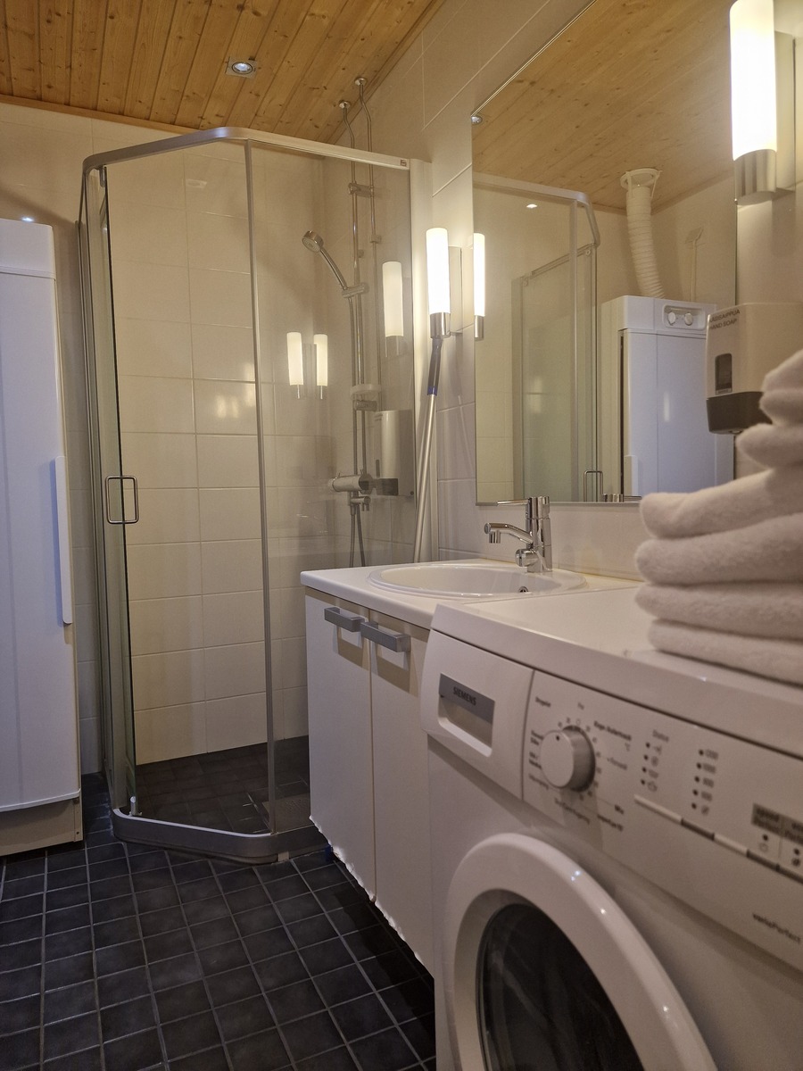• Varusteet: suihkukaappi, kuivauskaappi, lattialämmitys, suihku, peili, kiinteät valaisimet, kylpyhuonekaapisto