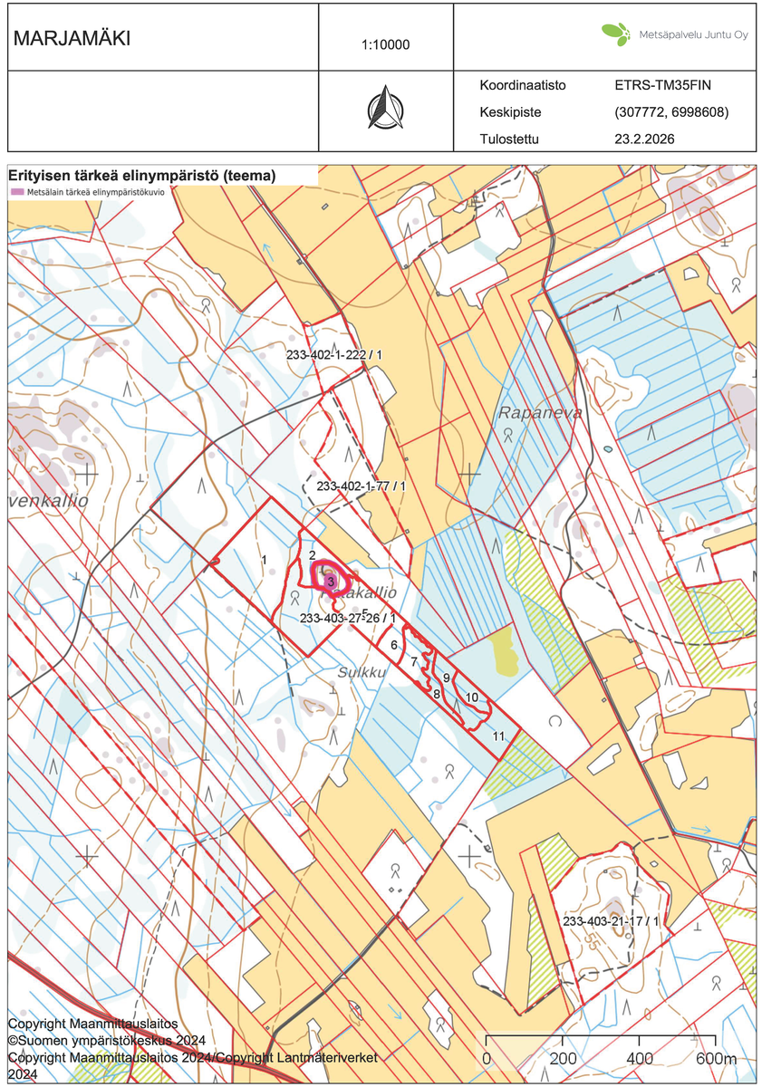 Kohteesta laadittu tila-arvio helmikuussa 2026 Metsäpalvelu Juntu Oy:n toimesta. Pääosin puolukkatyypin metsiä, kangasmaita 75% pinta-alasta. Kokonaispuusto n 1200 m3, joista valtaosa varttuneissa kasvatusmetsissä. Yksittäisiä Hannes-myrskyn aiheuttamia tuulenkaatoja pohjoispään kuvioilla. Kuviolla 4 runsaasti koivua heti hakattavissa. Kasvatusmetsät hyvässä kasvukunnossa. Taimikot metka-tukikelpoisia ja vaativat pian perkauksen. Pienialainen Patakallio merkitty erityisen tärkeäksi elinympäristöksi, soveltuu hyvin retki- ja laavukohteeksi.