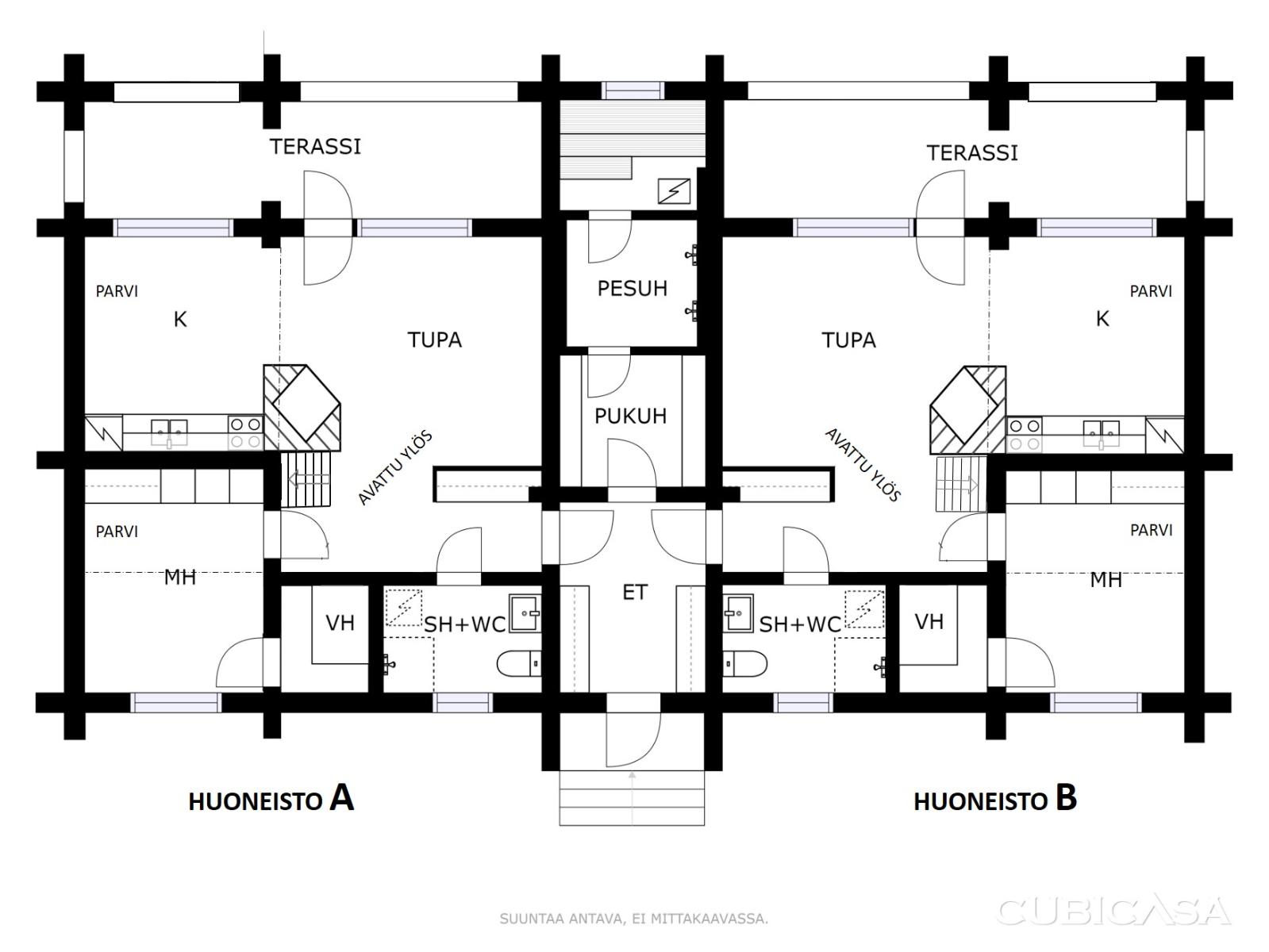 • Kelotuppilautaa, ylös avattu katto olohuone, parvi, makuuhuone ja eteinen